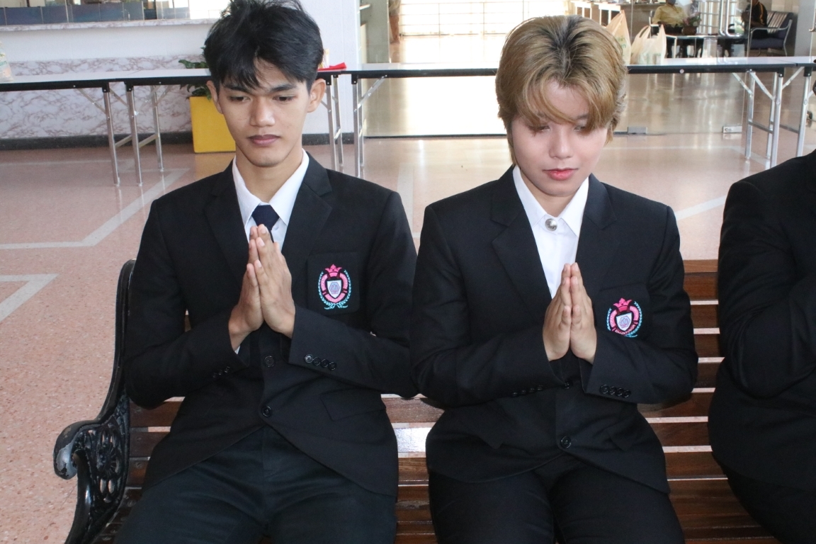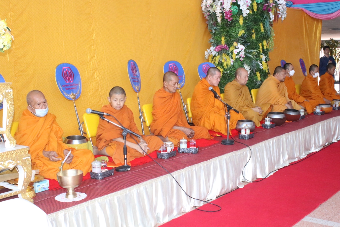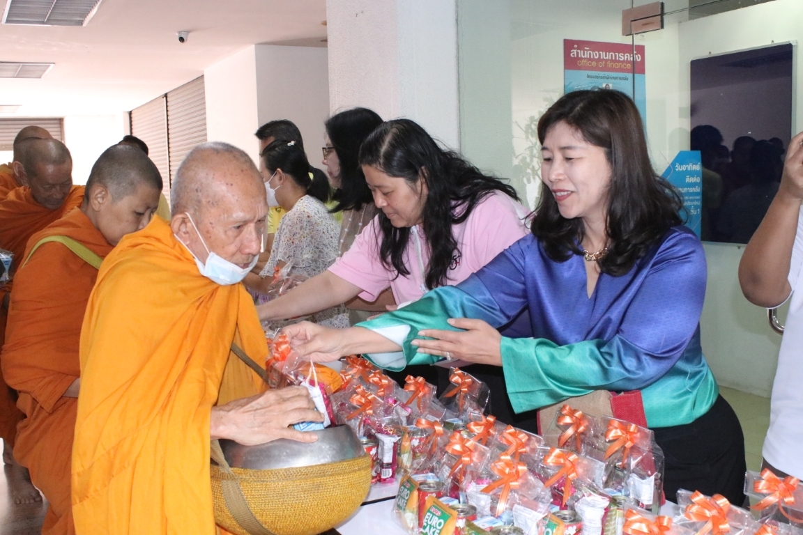 ภายในงานตกแต่งด้วยดอกไม้สีเหลืองสดใส พร้อมฉากหลังสีทอง สร้างบรรยากาศอันงดงามและศักดิ์สิทธิ์ นักศึกษาและบุคลากรร่วมทำบุญตักบาตรอย่างพร้อมเพรียง สะท้อนถึงความศรัทธาในพระพุทธศาสนาและการสืบสานวัฒนธรรมไทยในรั้วมหาวิทยาลัย