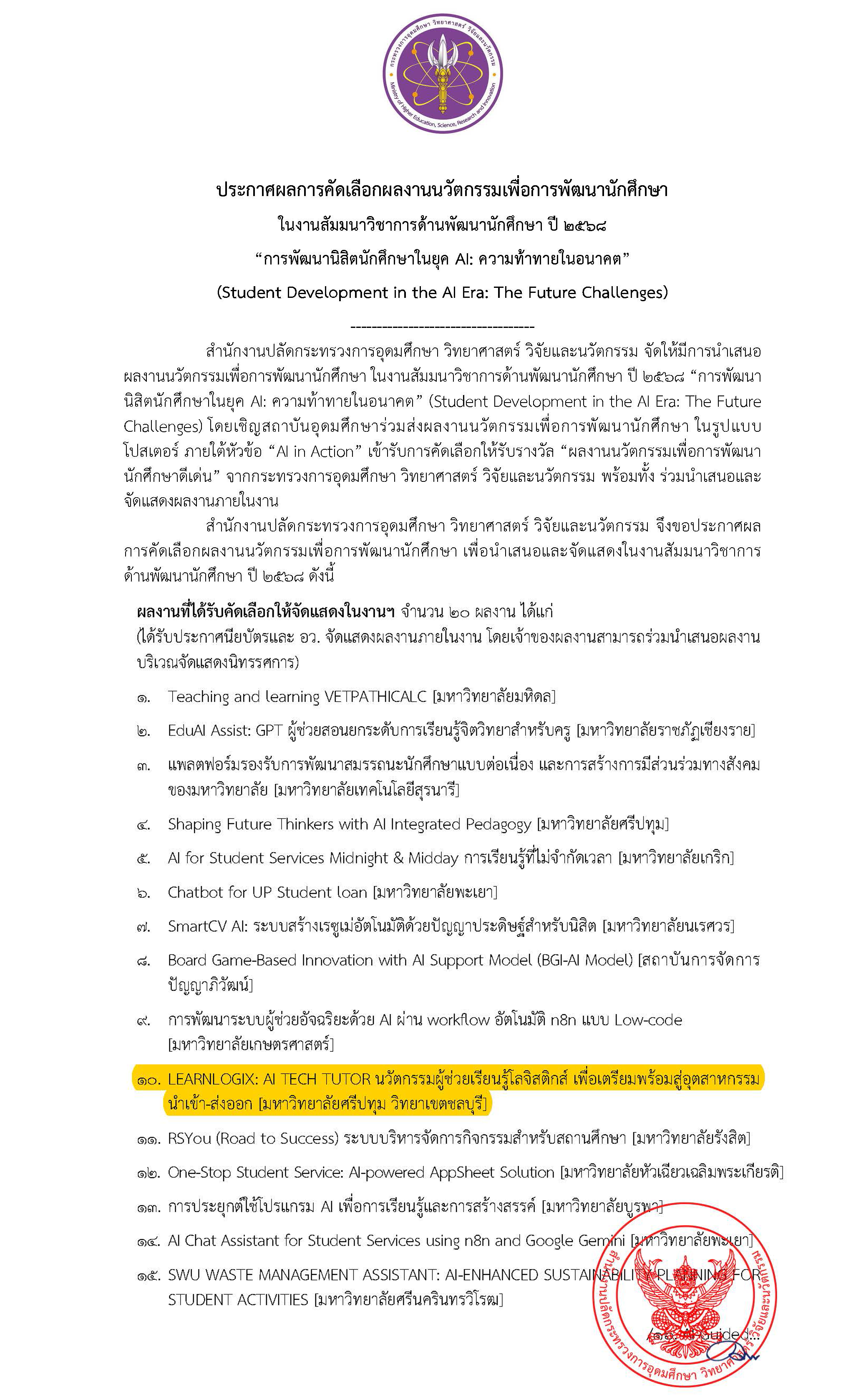 สำนักงานปลัดกระทรวงการอุดมศึกษา วิทยาศาสตร์ วิจัยและนวัตกรรม (อว.) ประกาศผลการคัดเลือกผลงานนวัตกรรมเพื่อการพัฒนานักศึกษาดีเด่น ในการสัมมนาวิชาการด้านพัฒนานักศึกษา ปี 2568 ภายใต้หัวข้อ 'การพัฒนานิสิตนักศึกษาในยุค AI: ความท้าทายในอนาคต' (Student Development in the AI Era: The Future Challenges) ผลงาน 'LEARNLOGIX: AI TECH TUTOR' จากนักศึกษาและคณาจารย์ มหาวิทยาลัยศรีปทุม วิทยาเขตชลบุรี ได้รับการคัดเลือกให้ติด 1 ใน 30 ทีม จากผู้สมัครทั่วประเทศกว่า 125 ทีม พร้อมสิทธิ์นำเสนอและจัดแสดงในงานสัมมนาระดับชาติ ภายใต้ธีม AI in Action จุดเด่นของผลงาน 'LEARNLOGIX: AI TECH TUTOR' คือนวัตกรรมผู้ช่วยเรียนรู้อัจฉริยะด้านโลจิสติกส์ ที่สามารถวิเคราะห์ข้อมูลผู้เรียน แนะนำเนื้อหา และสร้างสถานการณ์จำลอง เพื่อเตรียมความพร้อมสู่อุตสาหกรรมนำเข้า-ส่งออก ตอบโจทย์การเรียนรู้ในยุค AI อย่างแท้จริง ภายใต้แนวคิด เรียนอย่างเข้าใจ พร้อมใช้ได้จริง ผลงานชิ้นนี้ถือกำเนิดจากความร่วมมือระหว่าง การบูรณาการข้ามศาสตร์ 3 คณะ คณะโลจิสติกส์ คณะนิเทศศาสตร์ คณะเทคโนโลยีสารสนเทศ นำโดยคณาจารย์ผู้มีความเชี่ยวชาญ ซึ่งร่วมกันพัฒนา เครื่องมือเรียนรู้อัจฉริยะ (AI Tech Tutor) สำหรับนักศึกษาโลจิสติกส์ โดยมีทีมอาจารย์ที่ปรึกษา ดังนี้ ดร.กนกวรรณ สกุลทรงเดช หัวหน้าสาขาการจัดการโลจิสติกส์และโซ่อุปทาน (หัวหน้าโครงการ) หน้าที่: กำกับทิศทางและบริหารจัดการโครงการ วางแผนแนวทางการพัฒนาร่วมกับทีมที่ปรึกษา พร้อมออกแบบวิธีการเก็บข้อมูลจากนักศึกษา โดยใช้รายวิชา LSM387 การขนส่งทางทะเล เป็นกรณีศึกษา เพื่อรวบรวมข้อมูลจริงจากภาคสนาม มาประมวลผลและพัฒนาต่อยอดสู่ระบบ AI Tech Tutor อย่างมีประสิทธิภาพ ผศ.วราพร ดำจับ เลขานุการหลักสูตรนิเทศศาสตรมหาบัณฑิต คณะนิเทศศาสตร์ (รองหัวหน้าโครงการ) หน้าที่: ดูแลด้านการออกแบบการสื่อสารและภาพลักษณ์โครงการ วางโครงสร้างเนื้อหาและองค์ประกอบสื่อทั้งหมดให้สอดคล้องกับกลยุทธ์การสื่อสารยุคให.ม่ อาจารย์จิราภรณ์ ชมยิ้ม หัวหน้าสาขา คณะเทคโนโลยีสารสนเทศ (เลขานุการโครงการ) หน้าที่: รับผิดชอบการออกแบบและพัฒนาระบบเทคโนโลยีสารสนเทศ โดยเฉพาะส่วน Back-end ของระบบ AI Tech Tutor เพื่อพัฒนาฟังก์ชันการทำงานให้สามารถรองรับและตอบสนองข้อมูลที่หลากหลาย |