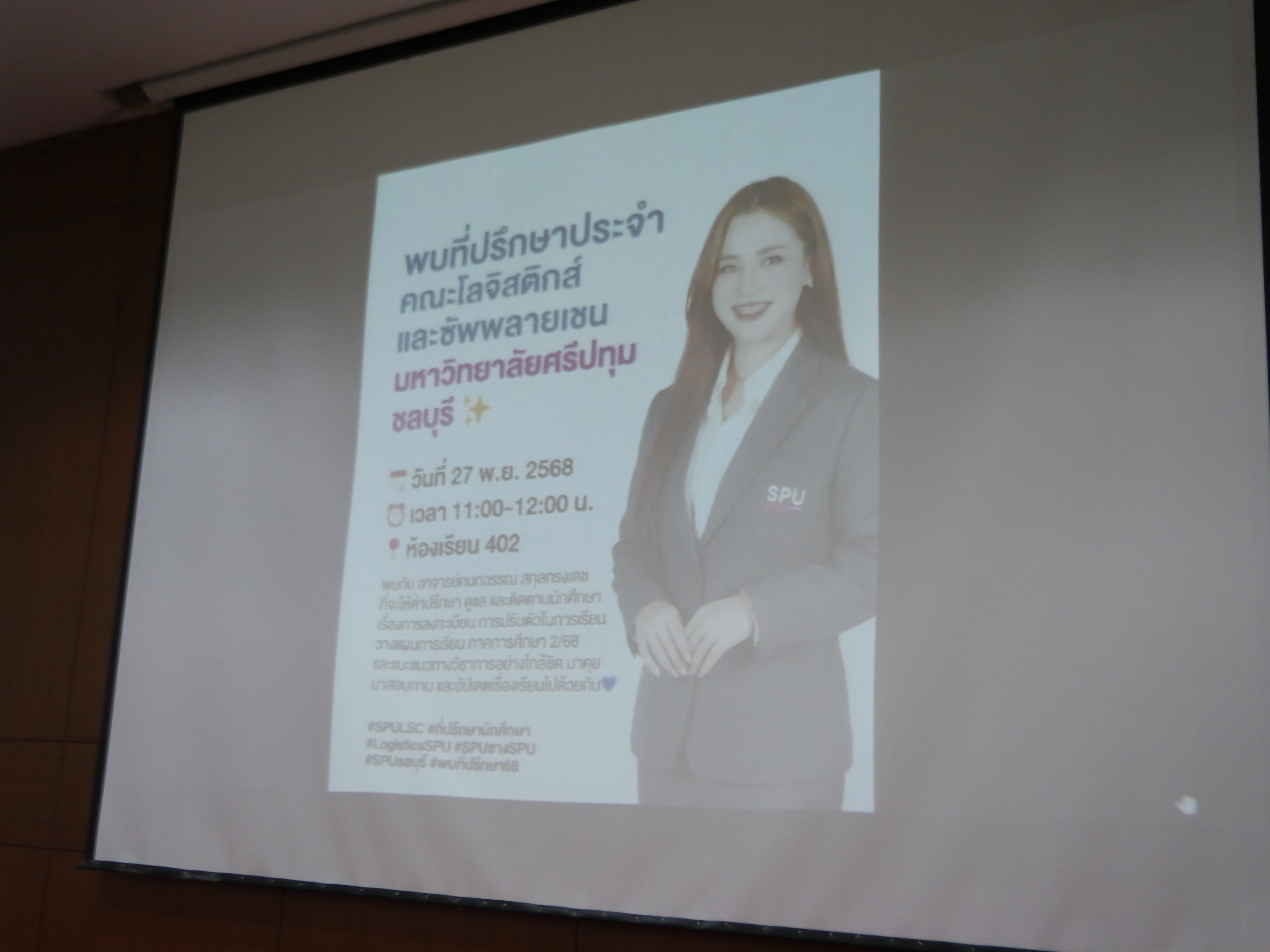 คณะโลจิสติกส์และซัพพลายเชน มหาวิทยาลัยศรีปทุม วิทยาเขตชลบุรี จัดกิจกรรมนักศึกษาพบอาจารย์ที่ปรึกษา ประจำปีการศึกษา 2568 โดยมี ดร.กนกวรรณ สกุลทรงเดช หัวหน้าสาขาการจัดการโลจิสติกส์และโซ่อุปทาน ให้คำปรึกษาแก่นักศึกษาชั้นปีที่ 2 และปีที่ 4